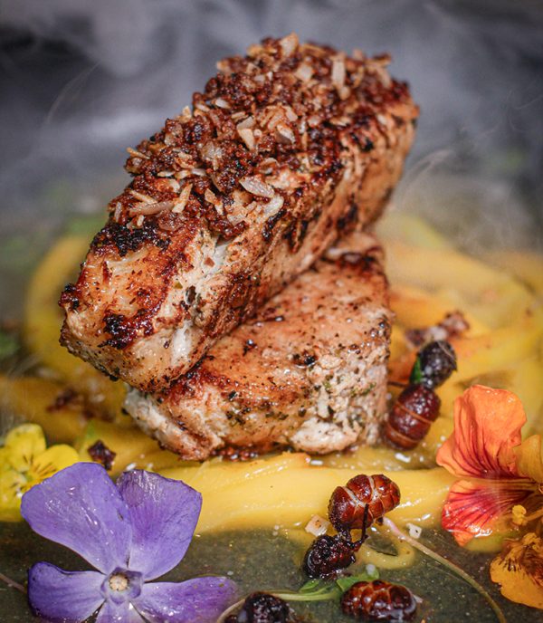 Exquisitas bolas de maduro rellenas de chicharroncito y queso, presentadas sobre una base de suero costeño y coronadas con una mermelada de pimentón.